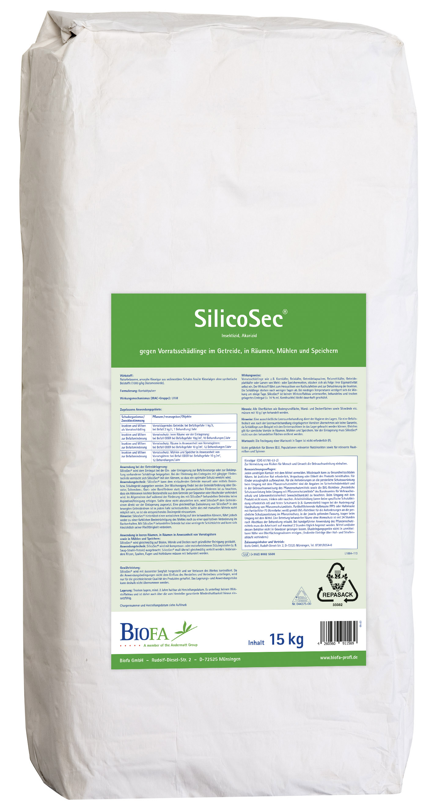 Schützen Sie Ihr Getreide natürlich mit SilicoSec®! Diese naturbelassene Kieselgur aus fossilen Kieselalgen trocknet Vorratsschädlinge wie Kornkäfer und Motten aus, indem sie sich selbst mit den Silikatpartikeln einstäuben. Dadurch erhalten Sie für Ihr trocken gelagertes Getreide (< 14 % Feuchtigkeit) einen dauerhaften Schutz. Einfach dem Getreidestrom beimischen, und schon wirkt es zuverlässig ohne Wirkstoffabbau.